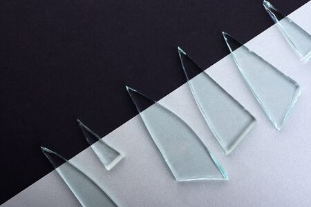 High-detail macro shot of broken glass pieces scattered in a random pattern on a dark backdrop.
