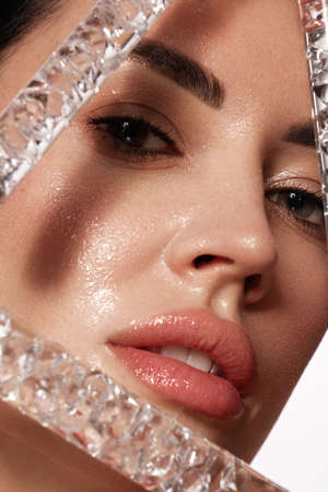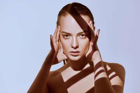 Beauty concept. Portrait of a beautiful young woman with fresh natural make-up and perfect healthy skin. The play of light and shadow. Fashion. Copy space.
