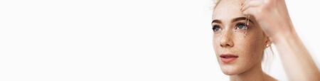 Portrait of positive woman with glitter visage isolated on grey, banner