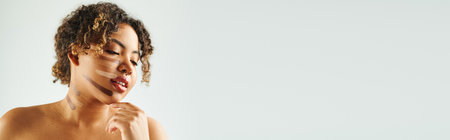 Beauty, aesthetic medicine, cosmetology concept. Web banner, portrait young african american woman with perfect pure skin look at camera, stand with naked shoulder against white copy space background