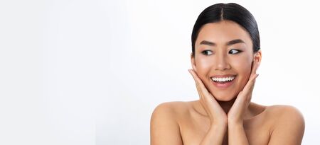 Surprised asian woman touching her cheeks and looking at free space on white background, panorama