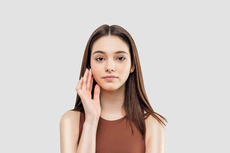 Beautiful Caucasian young woman with perfect skin touching face. Web banner