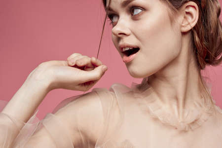 pretty woman gesture hands cosmetics fashion hairstyle posing pink background