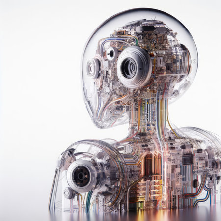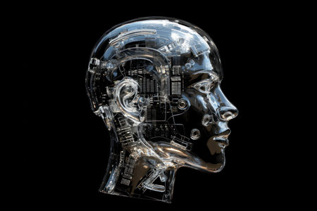 Futuristic transparent robot head design with intricate circuit patterns, representing the concept of artificial intelligence and technology.