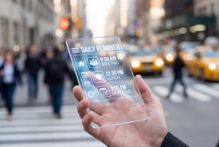 Closeup of a hand holding a futuristic transparent smartphone displaying a daily planner schedule interface with meetings and deadlines against a blurred background of a busy city street with taxis.