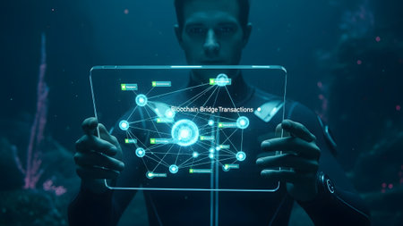 Tablet showing man in wetsuit holding transparent tablet displaying network...