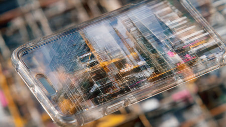 Close-up of a transparent phone case reflecting a cityscape, blending technology with urban scenery in a modern and artistic way.