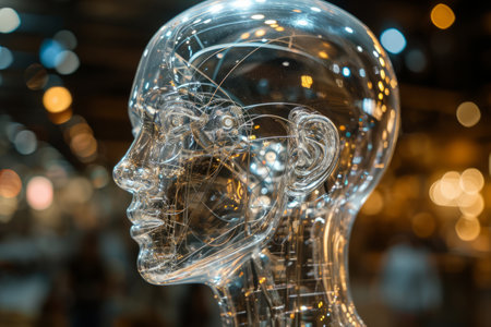 A transparent robotic head filled with intricate circuits and lights captures the fusion of art and technology. This modern piece explores themes of artificial intelligence.