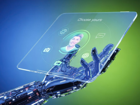The image depicts a highly advanced robotic hand carefully assembling a smartphone screen. The robotic hand is equipped with intricate mechanical fingers designed for precision work. The smartphone screen displays an interface with the text 'Choose Yours' and various icons, suggesting a customization or setup process. The background features a gradient of blue and green, highlighting the technological and futuristic theme of the scene.
