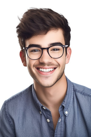studio shot of a happy young man wearing glasses against a white background, created with generative ai