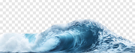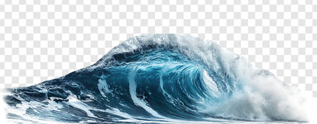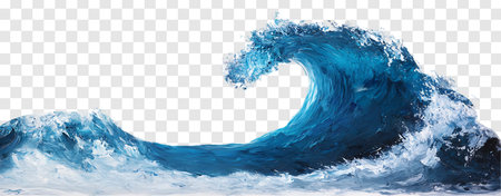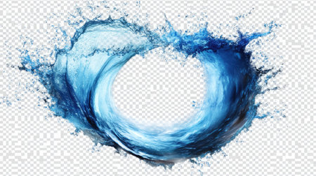 This image captures a dynamic splash of water, forming an elegant wave with vibrant blue hues against a transparent background. Perfect for creative projects.