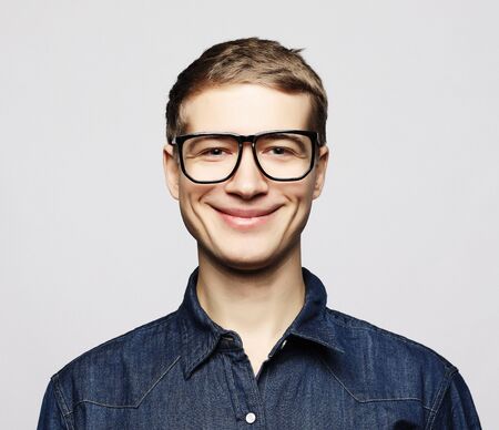 Portrait of a smart young man wearing eyeglasses standing against white background