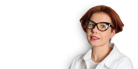 Portrait of a smiling young business woman in glasses, isolated on white background
