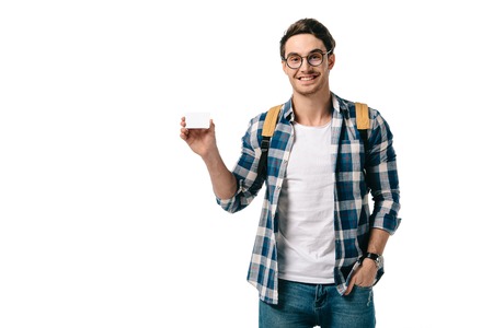 smiling handsome student showing credit card isolated on white