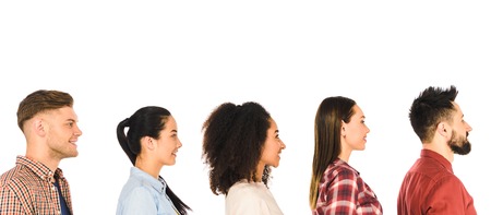 profile of smiling milticultural group of people isolated on white