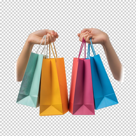 A person holding colorful shopping bags on transparent background