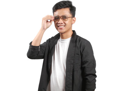 Young asian man wearing a black jacket and glasses isolated on white background