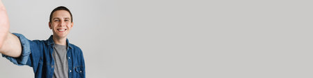 Young brunette man smiling and taking selfie photo isolated over white background