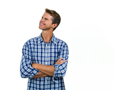 Smiling man standing with arms crossed against white background