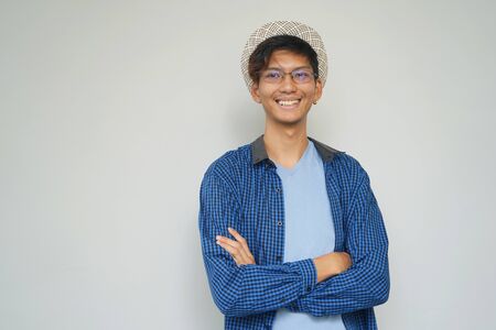 Young and carefree Good looking young man in jeans shirt and headwear keeping arms crossed and looking at camera with smile while standing against grey background : Generative AI