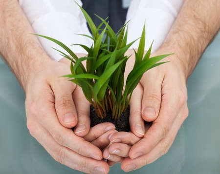 Midsection of businesspeople holding plant in cupped hands at table