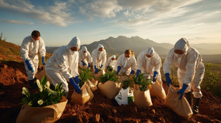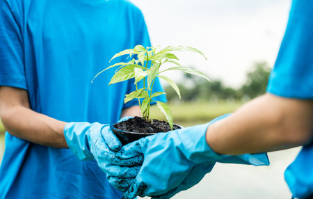 Volunteering Protection of environment and nature ecology concept. Group of volunteer plant a tree Plant trees water them till the soil. Nature for sustainable environment.Global warming concept.