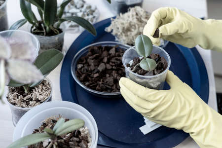 orchid transplanting, woman transplanting houseplants