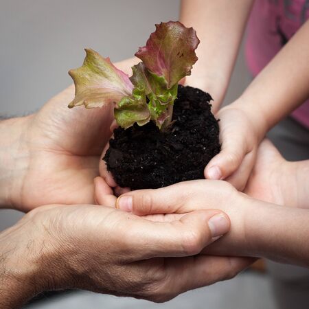 Adult and children hands holding baby plant