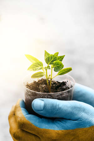 A man holds a green seedling in his Ukrainian yellow blue flag hands.