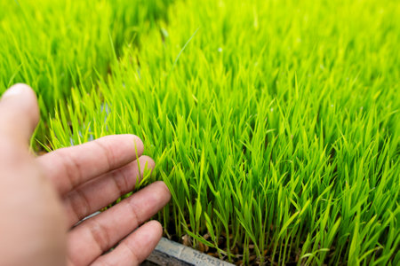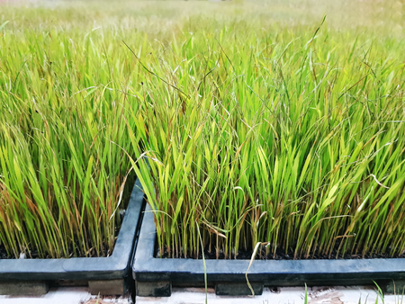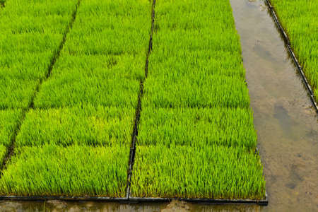 Close up of Preparing Rice Planting Seedlings in Fresh Water Tray Agricultural Cultivation