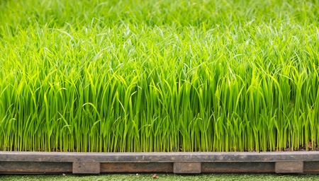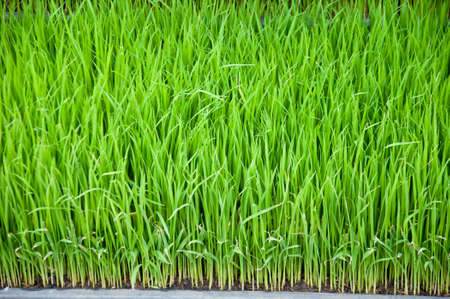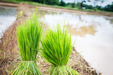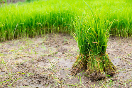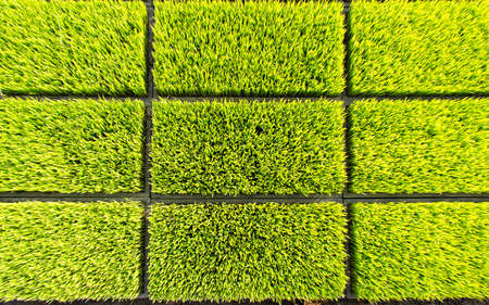 Close up new rice paddy field in north of Thailand. Beautiful green rice field. Rice is preparing for planting.