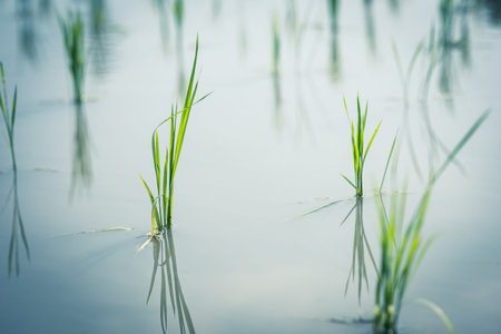 Selective focus on small young rice sprout growing in the rice field with water for organic farm and agriculture
