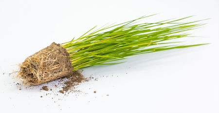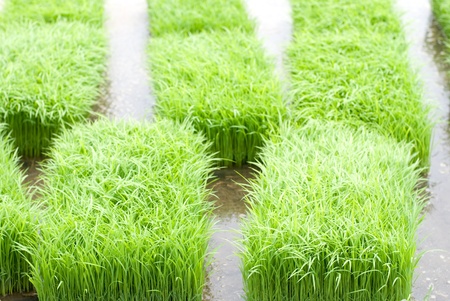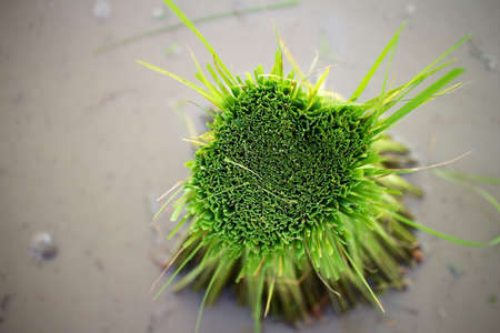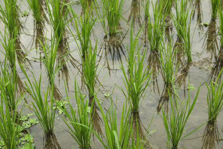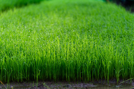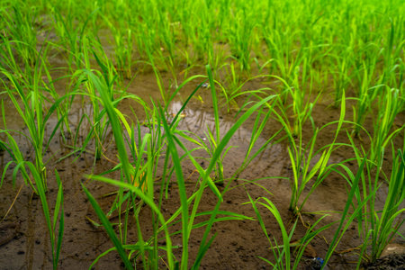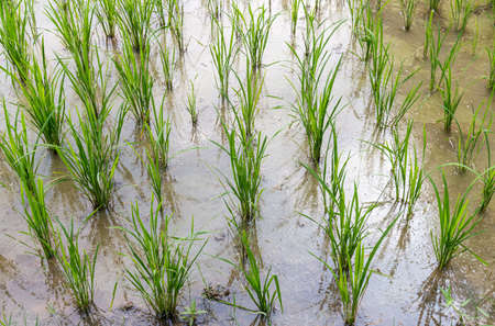 Closeup of the young rice plant in the paddy field after the planting season in the rain, front view for the background.