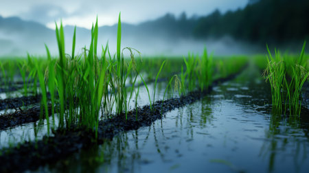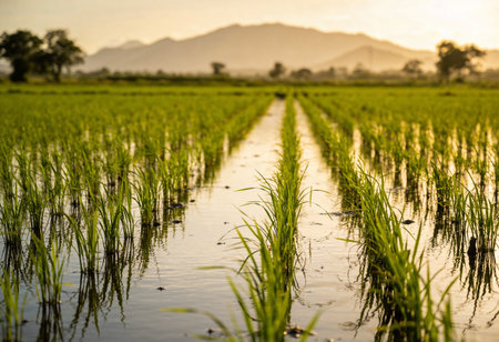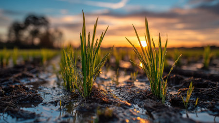 Vibrant green rice plants rise from reflective water at sunset, capturing the beauty of agricultural growth in a serene landscape filled with natural light.