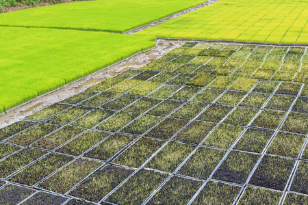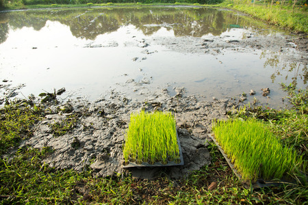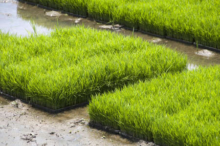 Before planting rice sprouts in the paddy field from contry of Kanagawa Japan