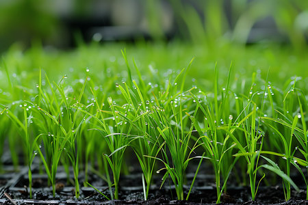 A close-up view of freshly planted rice seedlings in a waterlogged field, showcasing their green growth among black plastic trays.