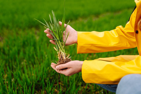 Farmer woman holding green wheat sprouts, checking growth. Scientist is checking the plant.