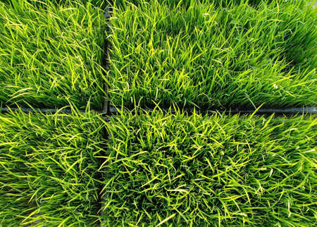 Close-up Green Fresh Young Rice Plants in Plastic Trays at Plantation Field