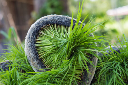Green rice seedlings in plastic pots on the ground in Thailand.