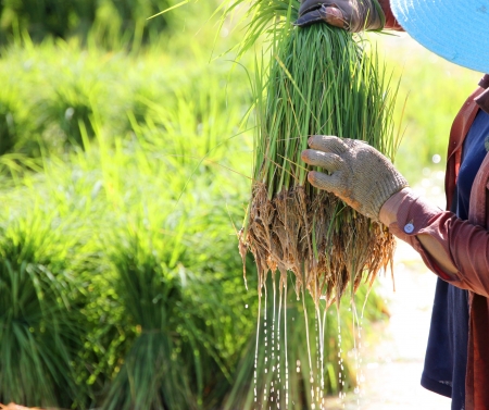 Hands of female farmer holding young rice sprout ready to grow in rice field. Farmer transplanting rice seedlings.Fragrant jasmine rice seedlings preparation for planting.Selective focus on left hand.