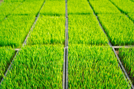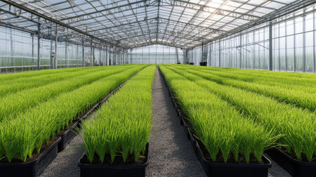 Vibrant green rice seedlings thrive in a spacious greenhouse, showcasing ideal agricultural practices and creating a sustainable farming environment.
