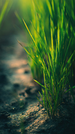 A close-up view of vibrant rice seedlings rising from waterlogged soil in a lush agricultural field. The warm natural light enhances the beauty of growth and sustainability.