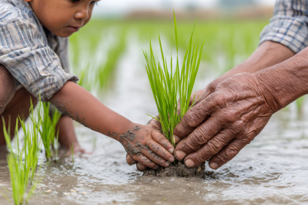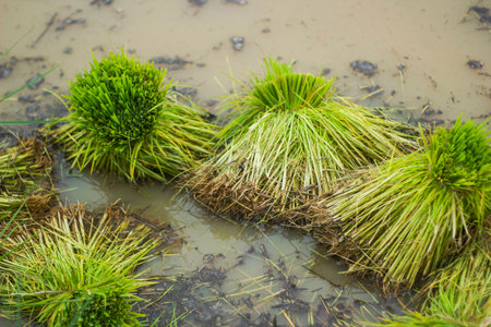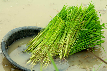 Close-up of rice seedlings being transplanted into flooded paddy fields, marking the beginning of the growth cycle and the promise of future harvests