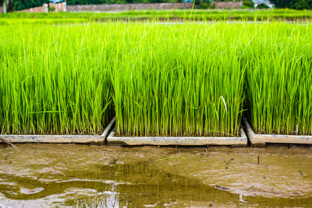 Image showcases vibrant green rice seedlings arranged in trays on muddy ground, highlighting agriculture and farming practices in a natural setting.