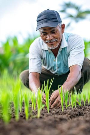 An agricultural worker kneels in a vibrant field, planting rice seedlings into rich, dark soil under a bright sky.