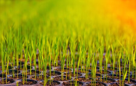 Farmer because Thai seedlings seedling trays for jasmine rice. On a soft morning sunlight background.