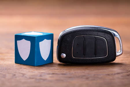 Elevated View Of Shield Shape On Block With Car Key On Wooden Table