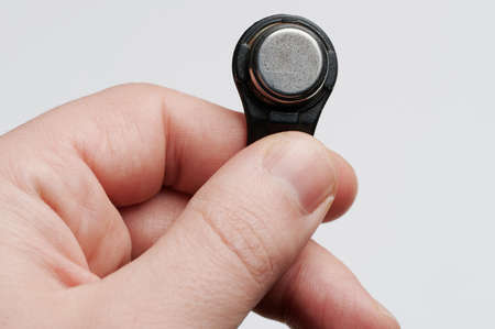Hand replacing coin cell battery in a car key fob on white surface.
