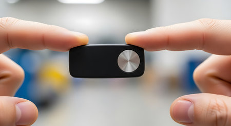 The image features a hand holding a small, rectangular object with black and yellow colors. The object appears to be a gadget or device. The image is set against a white background, making the object stand out clearly. This image is ideal for product showcases or tech-related content.