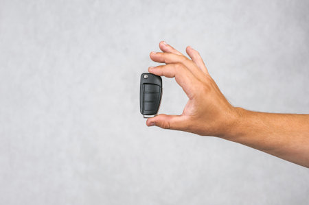 A hand clutches car keys, featuring a black plastic remote housing on one key. The neutral, well-lit background enhances the scene